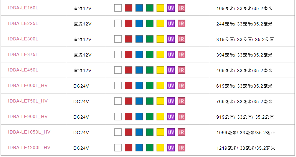 發出的顏色是白色,紅色,藍色,綠色,黃色,紅外線和紫外線,照射類型為可以照射高范圍的“ S型”和可以遠距離照射的“ L型”。